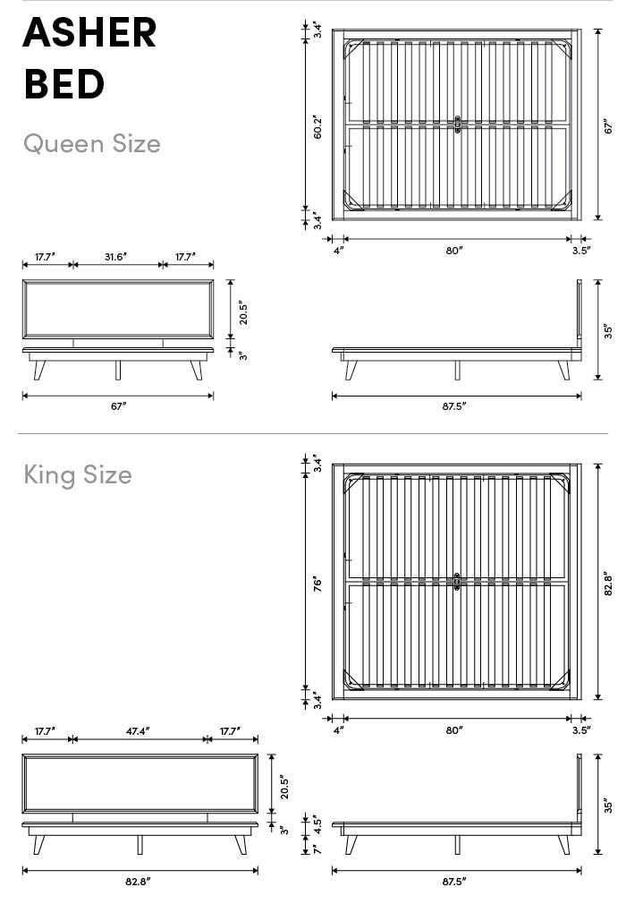 Asher's seamless joinery and beautiful walnut or ash veneer are inspired by the design of traditional teak Danish mid-century masterpieces. Carefully crafted and delicately sculpted, the frame is beveled with 45-degree edges that fall towards the center, encapsulating the security of the headboard. At the base, which sits wide above slim tapered solid wood legs, the complementary edges gently slope outwards, gradually bringing you down into deeper, dramatic slumber. The Asher Bed is available in King or Queen and is part of a five-piece set that completes the classic mid-century modern dream.