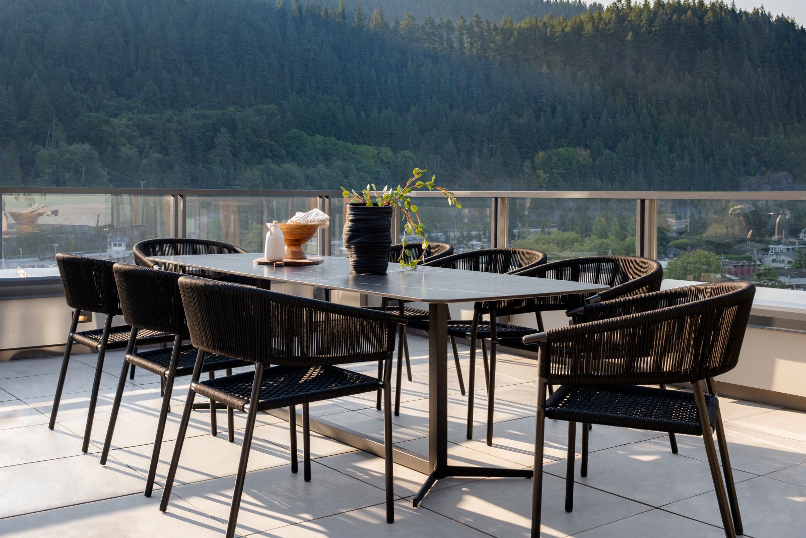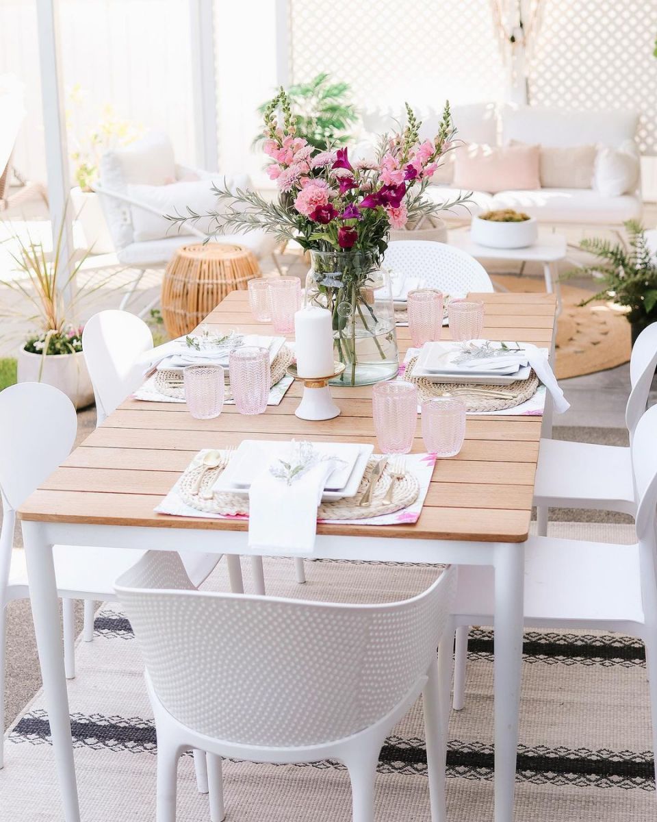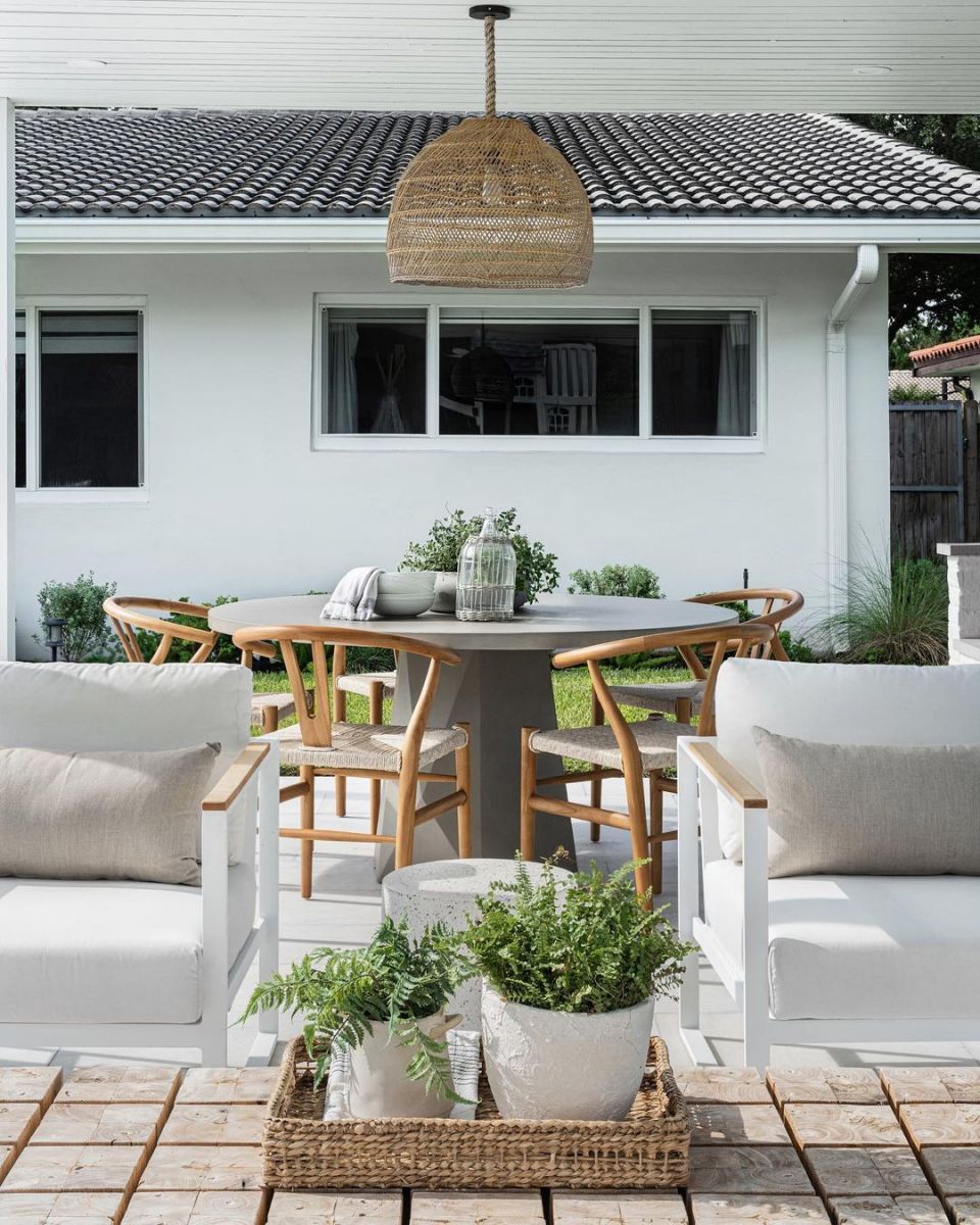 Design an inviting outdoor dining area perfect for hosting gatherings with friends and family. Consider seating capacity and style, and define the space with an outdoor rug or tiles for a distinct ambiance.