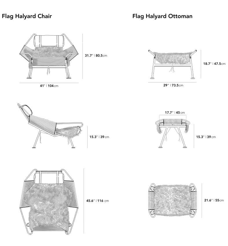 Perfectly balanced and built with a solid stainless steel frame and 240 meters of textured flag line, this modern industrial beauty upholds the iconic style of the original Danish design. As Hans Wegner conceived the idea for this chair while at the beach, the wide-set and low frame is naturally perfect for an afternoon rest, especially when matched with the cozy comfort of a sheepskin throw and down feather filled headrest. This set includes the matching Flag Halyard Ottoman.