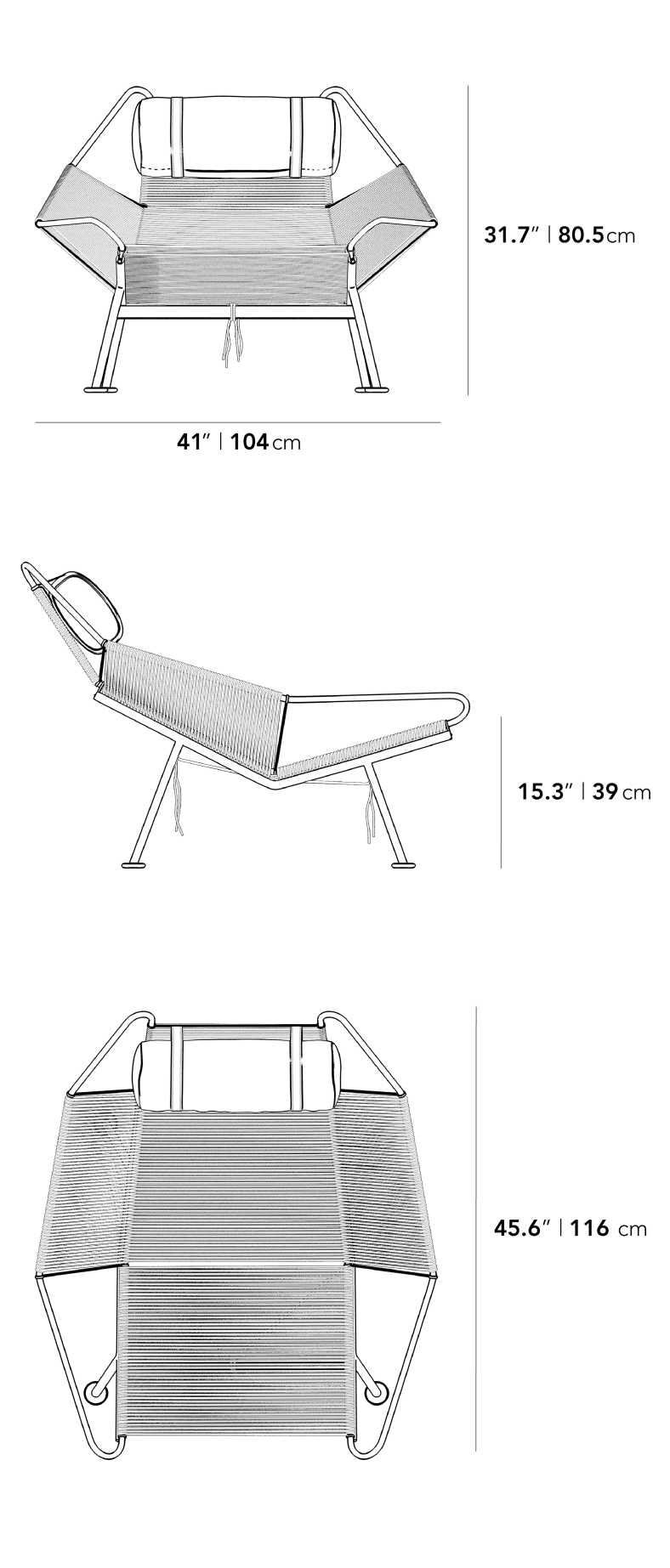 Perfectly balanced and built with a solid stainless steel frame and 240 meters of textured flag line, this modern industrial beauty upholds the iconic style of the original Danish design. As Hans Wegner conceived the idea for this chair while at the beach, the wide-set and low frame is naturally perfect for an afternoon rest, especially when matched with the cozy comfort of a sheepskin throw and vegan leather headrest.